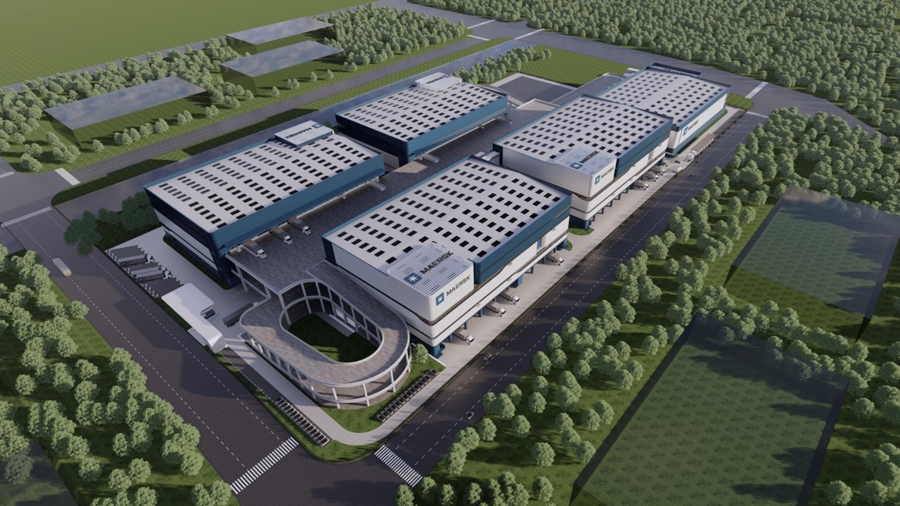 马士基临港综合物流旗舰仓全景效果图,几栋建筑是相连的。