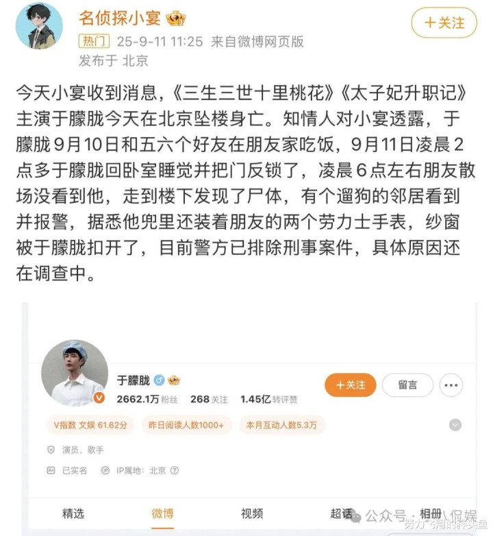 就是今天上午有记者在平台发文称于朦胧今天在北京坠楼身亡。